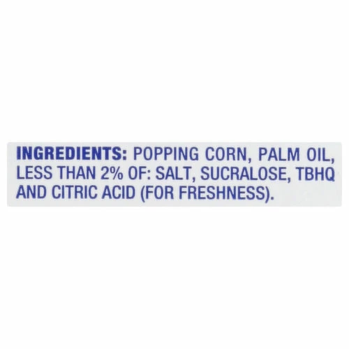 Popping Corn, Palm Oil, Less Than 2% of: Salt, Sucralose, TBHQ and Citric Acid (for Freshness).