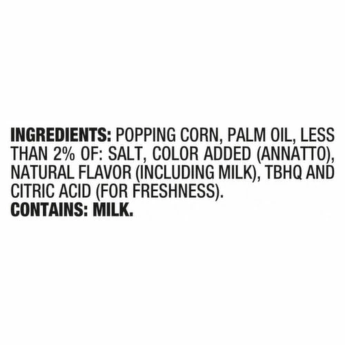 Popping Corn, Palm Oil, Less than 2% of: Salt, Color Added (Annatto), Natural Flavor (Including Milk), TBHQ and Citric Acid (for Freshness).