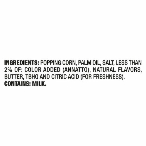 Popping Corn, Palm Oil, Salt, Less than 2% of: Color Added (Annatto), Natural Flavors, Butter, TBHQ and Citric Acid (for Freshness).