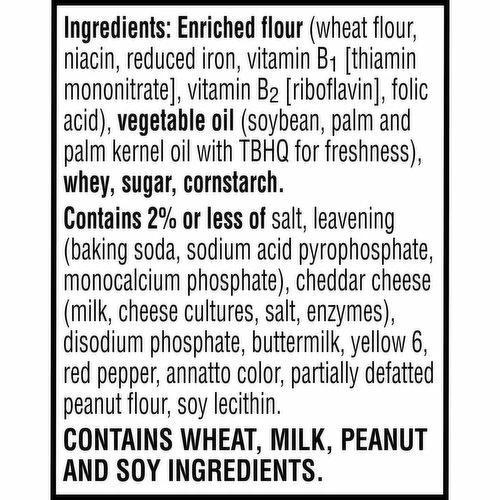 Enriched Flour (Wheat Flour, Niacin, Reduced Iron, Vitamin B1 [Thiamin Mononitrate], Vitamin B2 [Riboflavin], Folic Acid), Vegetable Oil (Soybean, Palm And Palm Kernel Oil With Tbhq For Freshness), Whey, Sugar, Cornstarch. Contains 2% Or Less Of Salt, Leavening (Baking Soda, Sodium Acid Pyrophosphate, Monocalcium Phosphate), Cheddar Cheese (Milk, Cheese Cultures, Salt, Enzymes), Disodium Phosphate, Buttermilk, Yellow 6, Red Pepper, Annatto Color, Partially Defatted Peanut Flour, Soy Lecithin.