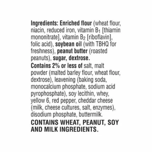 Enriched Flour (Wheat Flour, Niacin, Reduced Iron, Vitamin B1 [Thiamin Mononitrate], Vitamin B2 (Riboflavin], Folic Acid), Soybean Oil (with TBHQ for Freshness), Peanut Butter (Roasted Peanuts), Sugar, Dextrose, Contains 2% or Less of Salt, Malt Powder (Malted Barley Flour, Wheat Flour, Dextrose), Leavening (Baking Soda, Monocalcium Phosphate, Sodium Acid Pyrophosphate), Soy Lecithin, Whey, Yellow 6, Red Pepper, Cheddar Cheese (Milk, Cheese Cultures, Salt, Enzymes), Disodium Phosphate, Buttermilk.