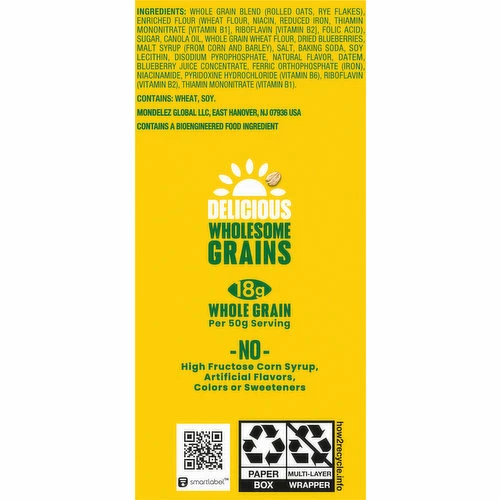 Whole Grain Blend (Rolled Oats, Rye Flakes), Enriched Flour (Wheat Flour, Niacin, Reduced Iron, Thiamin Mononitrate (Vitamin B1), Riboflavin (Vitamin B2), Folic Acid), Sugar, Canola Oil, Whole Grain Wheat Flour, Dried Blueberries, Malt Syrup (from Corn and Barley), Salt, Baking Soda, Soy Lecithin, Disodium Pyrophosphate, Natural Flavor, DATEM, Blueberry Juice Concentrate, Ferric Orthophosphate (Iron), Niacinamide, Pyridoxine Hydrochloride (Vitamin B6), Riboflavin (Vitamin B2), Thiamin Mononitrate (Vitamin B1).