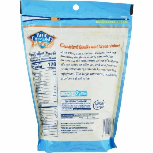 1 lb value pack. Consistent Quality and Great value! Since 1910, Blue Diamond Growers has been producing the finest quality almonds from orchards in the rich, fertile valleys of California. We are proud to offer you and your family our prime selection of almonds for your snacking enjoyment. This large, convenient, resealable bag provides a great value. From the almond people.