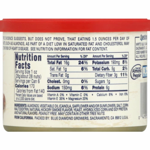 Irresistible snacking! Smart eating! The one the only Smokehouse. From the almond people. Scientific evidence suggests, but does not prove, that eating 1.5 ounces per day of most nuts, such as almonds, as part of a diet low in saturated fat and cholesterol may reduce the risk of heart disease. See nutrition information for fat content. Peanut free. Question or comments? Write Blue Diamond customer support, Sacramento, CA 95812. Please include code number found on bottom of can with all inquiries. www.bluediamond.com. From the almond people. 5 g total carbs – 3 g fiber = 2 g net carbs per serving. From California.