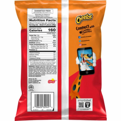 Gluten free. Made with real cheese. Chester Cheetah. fritolay.com. SmartLabel: Scan for more food information or call 1-800-352-4477. Connect with Facebook. Facobook.com/cheetos. Twitter. (at)cheesterCheetah. Instagram.(at)Cheetos. Questions or comments? Weekdays 9:00am to 4:30pm CT 1-800-352-4477/email or chart at fritolay.com.