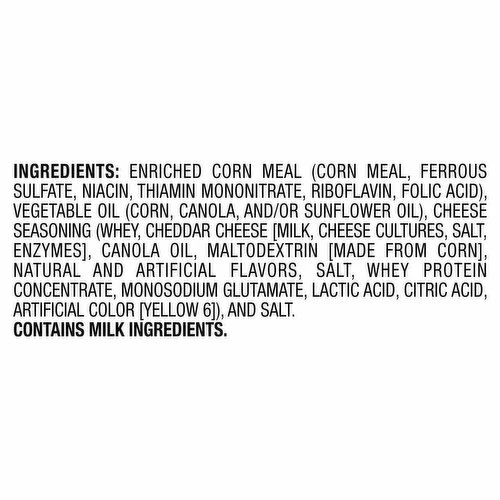 Enriched Corn Meal (Corn Meal, Ferrous Sulfate, Niacin, Thiamin Mononitrate, Riboflavin, Folic Acid), Vegetable Oil (Corn, Canola, and/or Sunflower Oil), Cheese Seasoning (Whey, Cheddar Cheese [Milk, Cheese Cultures, Salt, Enzymes], Canola Oil, Maltodextrin [Made from Corn], Natural and Artificial Flavors, Salt, Whey Protein Concentrate, Monosodium Glutamate, Lactic Acid, Citric Acid, Artificial Color [Yellow 6]), and Salt.
