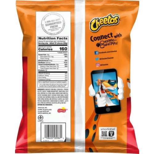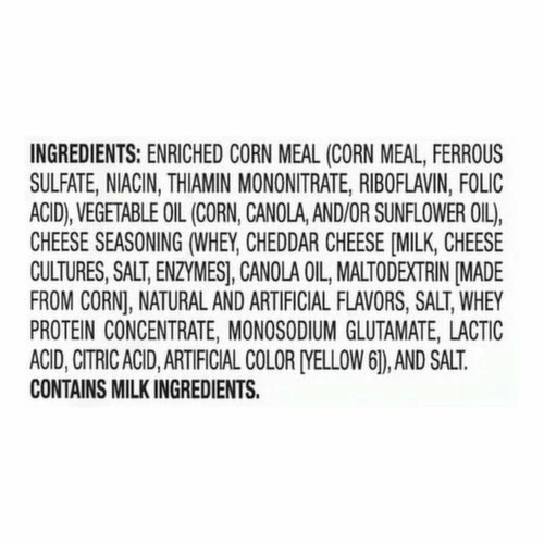 Enriched Corn Meal (Corn Meal, Ferrous Sulfate, Niacin, Thiamin Mononitrate, Riboflavin, Folic Acid), Vegetable Oil (Corn, Canola, and/or Sunflower Oil), Cheese Seasoning (Whey, Cheddar Cheese [Milk, Cheese Cultures, Salt, Enzymes], Canola Oil, Maltodextrin [Made from Corn], Natural and Artificial Flavors, Salt, Whey Protein Concentrate, Monosodium Glutamate, Lactic Acid, Citric Acid, Artificial Color [Yellow 6]), and Salt.