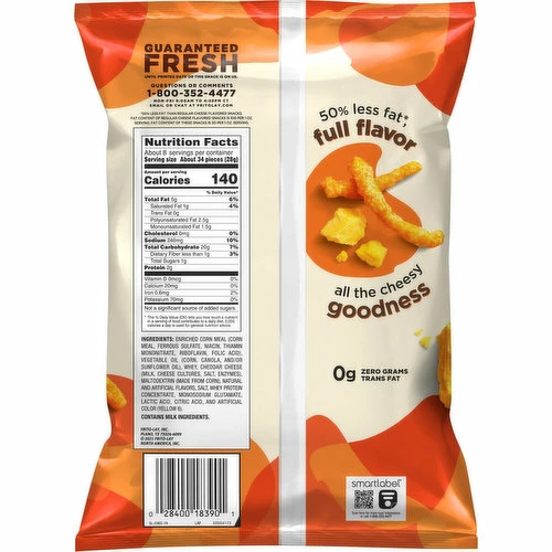 Made with real cheese! Zero grams trans fat. Gluten free. 50% less fat than regular cheese flavored snacks (50% less fat than regular cheese flavored snacks. Fat content of regular cheese flavored snacks is 10 g per 1 oz. serving; fat content of these snacks is 5 g per 1 oz. serving). 50% less fat (50% less fat than regular cheese flavored snacks. Fat content of regular cheese flavored snacks is 10 g per 1 oz. serving; fat content of these snacks is 5 g per 1 oz. serving), full flavor. All the cheesy goodness. fritolay.com. Smartlabel: Scan for more food information or call 1-800-352-4477. Questions or comments? 1-800-352-4477 Mon-Fri 9:00 am to 4:30 pm CT. email or chat at fritolay.com.