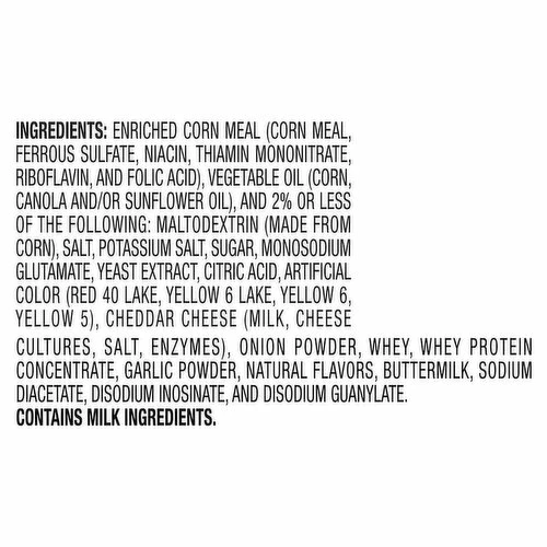 Enriched Corn Meal (Corn Meal, Ferrous Sulfate, Niacin, Thiamin Mononitrate, Riboflavin, and Folic Acid), Vegetable Oil (Corn, Canola and/or Sunflower Oil), and 2% or Less of the Following: Maltodextrin (Made from Corn), Salt, Potassium Salt, Sugar, Monosodium Glutamate, Yeast Extract, Citric Acid, Artificial Color (Red 40 Lake, Yellow 6 Lake, Yellow 6, Yellow 5), Cheddar Cheese (Milk, Cheese Cultures, Salt, Enzymes), Onion Powder, Whey, Whey Protein Concentrate, Garlic Powder, Natural Flavors, Buttermilk, Sodium Diacetate, Disodium Inosinate, and Disodium Guanylate.