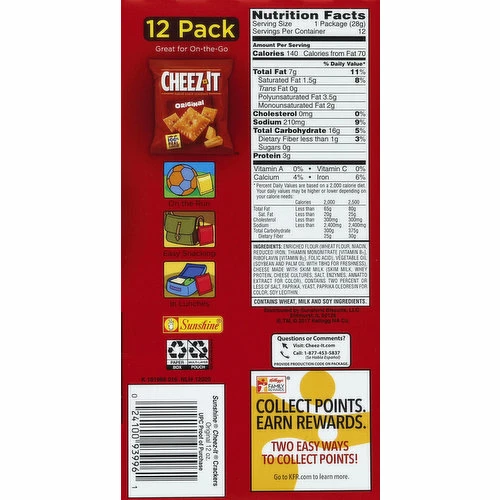 Great for on-the-go. You could instantly win $25 Crayola Cash (awarded in the form of an electronic reward card). Kellogg’s Family Rewards. Per Pouch: 140 calories; 1.5 g sat fat (8% DV); 210 mg sodium (9% DV); 0 g sugars. On the run. Easy snacking. In lunches. how2recycle.info. You Could Instantly Win $25 in Crayola Cash: 1. Look inside to see if you have a winning game piece. 2. Go to kellogscrayolarewards.com to claim your Crayola cash prize. Recolor coloring book. Free coloring app. 7 exclusive designs. Download the REcolor app on the Apple app store or on Google Play. Explore seven exclusive coloring pages including 3-D Kellog’s and Keebler characters. Color your designs with specialty color palettes. Share: Facebook; Instagram. Questions or comments? Visit: Cheez-It.com. Call: 1-877-453-5837. Provide production code on package. Collect points. Earn rewards. Two easy ways to collect points! Go to KFR.com to learn more.