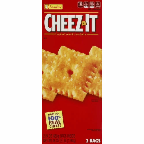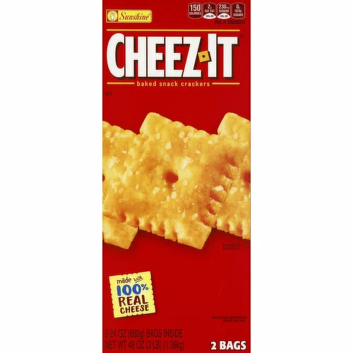 Outrageously cheesy and ridiculously craveable, Cheez-It baked snack crackers are deliciously crunchy little crackers that have captured cheese-lovers for decades. Discover a crowd-favorite snack made with 100% real cheese baked to crispy perfection for an irresistible taste in every crunchy bite. Each lightly salted cracker is loaded with a burst of cheesy flavor; Cheez-It baked snack crackers are a fan-favorite for game night, school snacks, family movie nights, party spreads, late-night snacking, and so much more, the cheesy options are endless. Delicious for all ages, grab a box of Cheez-It Original crackers for every family snacking moment. Whether you’re packing them in school lunches, grabbing some for the office, or taking along on a road trip, you’ll find a delicious, crisp snack that is filled with big cheese flavor. It’s no wonder that these bite-sized crackers have become a crowd-favorite, bringing smiles and that urge for just one more handful.