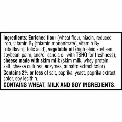Enriched Flour (Wheat Flour, Niacin, Reduced Iron, Vitamin B1 [Thiamin Mononitrate], Vitamin B2 [Riboflavin], Folic Acid), Vegetable Oil (High Oleic Soybean, Soybean, Palm, And/Or Canola Oil With Tbhq For Freshness), Cheese Made With Skim Milk (Skim Milk, Whey Protein, Salt, Cheese Cultures, Enzymes, Annatto Extract Color). Contains 2% Or Less Of Salt, Paprika, Yeast, Paprika Extract Color, Soy Lecithin.