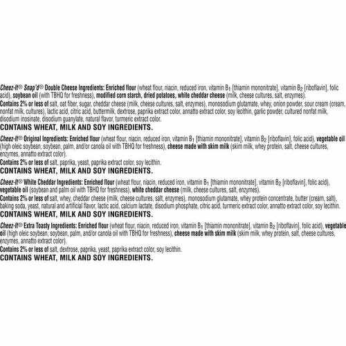 Enriched Flour (Wheat Flour, Niacin, Reduced Iron, Vitamin B1 [Thiamin Mononitrate], Vitamin B2 [Riboflavin], Folic Acid), Vegetable Oil (High Oleic Soybean, Soybean, Palm, And/Or Canola Oil With Tbhq For Freshness), Cheese Made With Skim Milk (Skim Milk, Whey Protein, Salt, Cheese Cultures, Enzymes, Annatto Extract Color).Contains 2% Or Less Of Salt, Dextrose, Paprika, Yeast, Paprika Extract Color, Soy Lecithin.