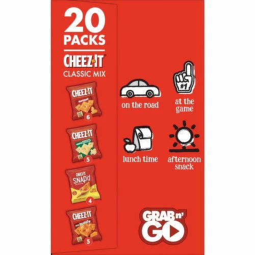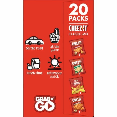 Outrageously cheesy and perfectly portable, these pouches of Cheez-It baked snack crackers and cheese cracker chips contain deliciously crunchy crackers that have captured cheese-lovers for decades. This variety pack includes Original, White Cheddar, and Extra Toasty plus Cheez-It Snap’d Double Cheese flavors, enough flavors to satisfy any snack craving. Each crisp is loaded with bold cheesy flavor. These Cheez-It crackers are conveniently packaged for on-the-go snacking; Cheez-It cheese crackers are an on-the-go fan-favorite for game night, school snacks, lunches, family movie nights, late-night snacking, and so much more, the cheesy options are endless. Delicious for all ages, grab a pouch of Cheez-It crackers for every family snacking moment. Whether you’re grabbing some for the office or on a road trip, you’ll find a snack that’s filled with big cheese flavor. It’s no wonder that these crackers have become a crowd-favorite, bringing smiles and that urge for just one more handful.