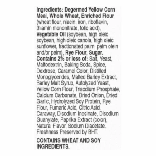 Degermed Yellow Corn Meal, Whole Wheat, Enriched Flour (Wheat Flour, Niacin, Iron, Riboflavin, Thiamin Mononitrate, Folic Acid), Vegetable Oil (Soybean, High Oleic Soybean, High Oleic Canola, High Oleic Sunflower, Fractionated Palm, Palm Olein and/or Palm), Rye Flour, Sugar, Contains 2% or Less of: Salt, Yeast, Maltodextrin, Baking Soda, Spice, Dextrose, Caramel Color, Distilled Monoglycerides, Malted Barley Extract, Barley Malt Syrup, Autolyzed Yeast, Yellow Corn Flour, Trisodium Phosphate, Calcium Carbonate, Dried Onion, Dried Garlic, Hydrolyzed Soy Protein, Rye Flour, Fumaric Acid, Citric Acid, Caraway, Disodium Inosinate, Disodium Guanylate, Paprika Extract (Color), Natural Flavor, Sodium Diacetate, Freshness Preserved by BHT.