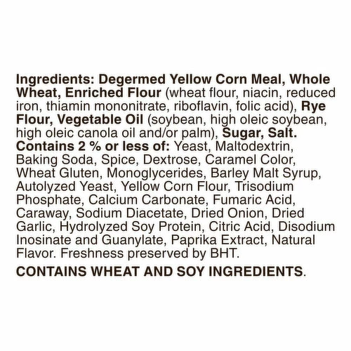Degermed Yellow Corn Meal, Whole Wheat, Enriched Flour (Wheat Flour, Niacin, Iron, Riboflavin, Thiamin Mononitrate, Folic Acid), Vegetable Oil (Soybean, High Oleic Soybean, High Oleic Canola, High Oleic Sunflower, Fractionated Palm, Palm Olein and/or Palm), Rye Flour, Sugar, Contains 2% or Less of: Salt, Yeast, Maltodextrin, Baking Soda, Spice, Dextrose, Caramel Color, Distilled Monoglycerides, Malted Barley Extract, Barley Malt Syrup, Autolyzed Yeast, Yellow Corn Flour, Trisodium Phosphate, Calcium Carbonate, Dried Onion, Dried Garlic, Hydrolyzed Soy Protein, Rye Flour, Fumaric Acid, Citric Acid, Caraway, Disodium Inosinate, Disodium Guanylate, Paprika Extract (Color), Natural Flavor, Sodium Diacetate, Freshness Preserved by BHT.