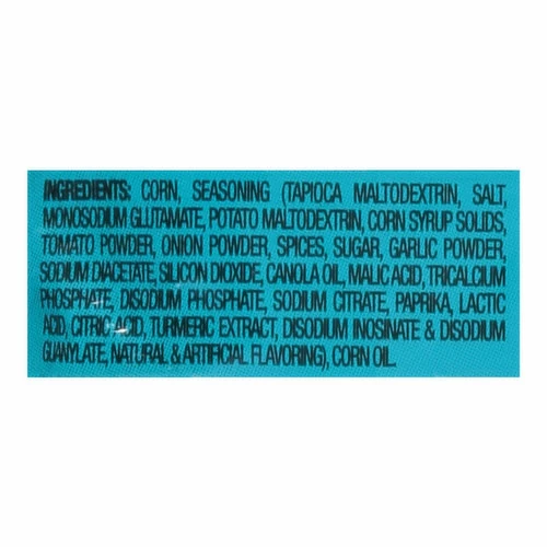 Corn, Seasoning (Tapioca Maltodextrin, Salt, Monosodium Glutamate, Potato Maltodextrin, Corn Syrup Solids, Tomato Powder, Onion Powder, Spices, Sugar, Garlic Powder, Sodium Diacetate, Silicon Dioxide, Canola Oil, Malic Acid, Tricalcium Phosphate, Disodium Phosphate, Sodium Citrate, Paprika, Lactic Acid, Citric Acid, Turmeric Extract, Disodium Inosinate & Disodium Guanylate, Natural & Artificial Flavoring), Corn Oil.