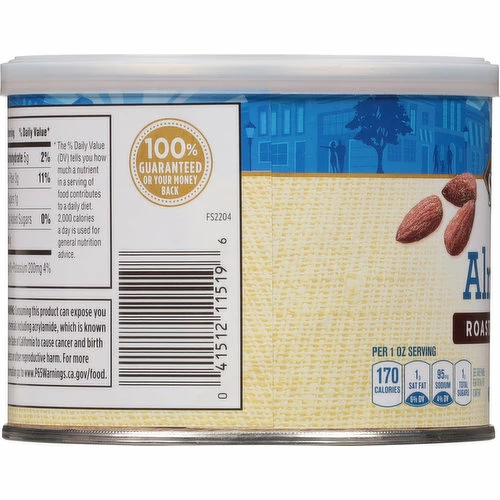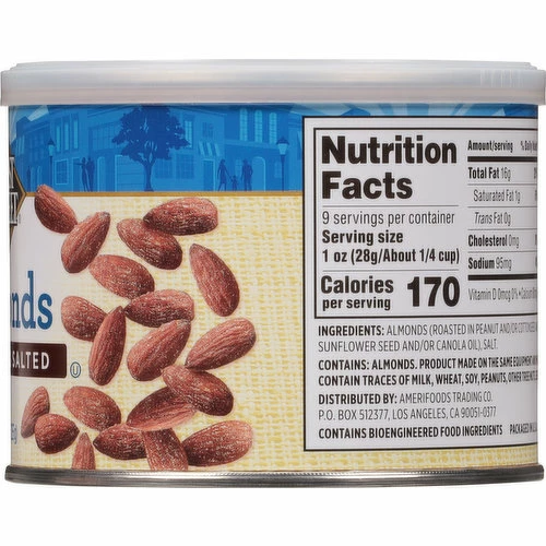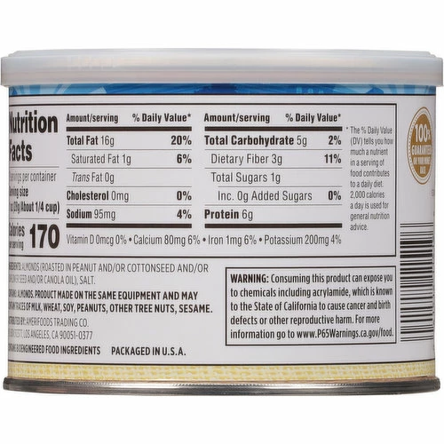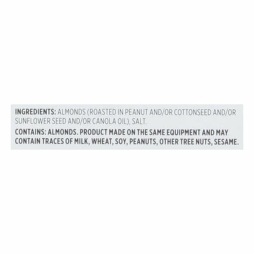 Almonds (Roasted in Peanut and/or Cottonseed and/or Sunflower Seed and/or Canola Oil), Salt.