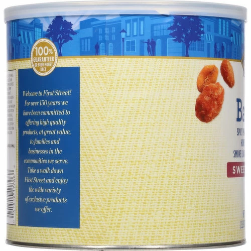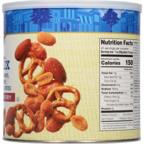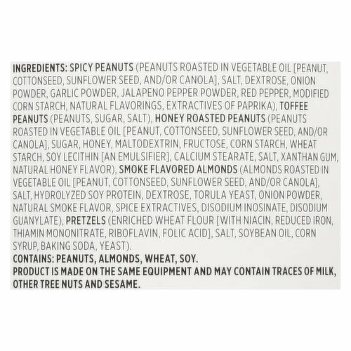 Spicy Peanuts (Peanuts Roasted in Vegetable Oil [Peanut, Cottonseed, Sunflower Seed, and/or Canola], Salt, Dextrose, Onion Powder, Garlic Powder, Jalapeno Pepper Powder, Red Pepper, Modified Corn Starch, Natural Flavorings, Extractives of Paprika), Toffee Peanuts (Peanuts, Sugar, Salt), Honey Roasted Peanuts (Peanuts Roasted in Vegetable Oil [Peanut, Cottonseed, Sunflower Seed, and/or Canola], Sugar, Honey, Maltodextrin, Fructose, Corn Starch, Wheat Starch, Soy Lecithin [an Emulsifier], Calcium Stearate, Salt, Xanthan Gum, Natural Honey Flavor), Smoke Flavored Almonds (Almonds Roasted in Vegetable Oil [Peanut, Cottonseed, Sunflower Seed, and/or Canola], Salt, Hydrolyzed Soy Protein, Dextrose, Torula Yeast, Onion Powder, Natural Smoke Flavor, Spice Extractives, Disodium Inosinate, Disodium Guanylate), Pretzels (Enriched Wheat Flour [with Niacin, Reduced Iron, Thiamin Mononitrate, Riboflavin, Folic Acid], Salt, Soybean Oil, Corn Syrup, Baking Soda, Yeast).