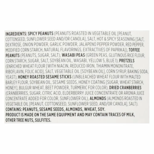 Spicy Peanuts (Peanuts Roasted in Vegetable Oil [Peanut, Cottonseed, Sunflower Seed and/or Canola], Salt, Hot & Spicy Seasoning [Salt, Dextrose, Onion Powder, Garlic Powder, Jalapeno Pepper Powder, Red Pepper, Modified Corn Starch, Natural Flavorings, Extractives of Paprika]), Toffee Peanuts (Peanuts, Sugar, Salt), Wasabi Peas (Green Peas, Glutinous Rice Flour, Corn Starch, Sugar, Salt, Soybean Oil, Wasabi, Yellow 5, Blue 1), Pretzels (Enriched Wheat Flour [with Niacin, Reduced Iron, Thiamin Mononitrate, Riboflavin, Folic Acid], Salt, Vegetable Oil [Soybean Oil], Corn Syrup, Baking Soda, Yeast), Honey Roasted Sesame Sticks (Unbleached Wheat Flour with Malted Barley Flour, Soybean Oil, Sesame Seeds, Honey Coating [Sugar, Wheat Starch, Honey], Bulgur Wheat, Beet Powder, Turmeric for Color), Dried Cranberries (Cranberries, Sugar, Citric Acid, Elderberry Juice Concentrate or Aronia Juice Concentrate Added for Color, Sunflower Oil), Almonds (Almonds Roasted in Vegetable Oil [Peanut, Cottonseed, Sunflower Seed, and/or Canola], Salt).