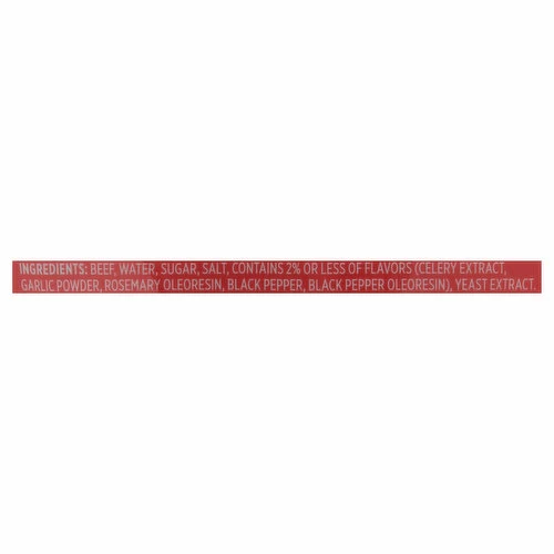 Beef, Water, Sugar, Salt, Contains 2% or Less of Flavors (Celery Extract, Garlic Powder, Rosemary Oleoresin, Black Pepper, Black Pepper Oleoresin), Yeast Extract.