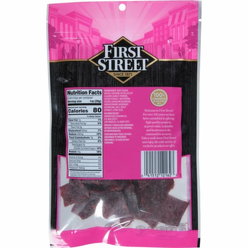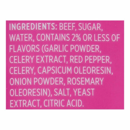 Beef, Sugar, Water, Contains 2% or Less of Flavors (Garlic Powder, Celery Extract, Red Pepper, Celery, Capsicum Oleoresin, Onion Powder, Rosemary Oleoresin), Salt, Yeast Extract, Citric Acid.