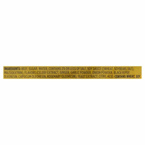 Beef, Sugar, Water, Contains 2% or Less of Salt, Soy Sauce ([Wheat, Soybeans, Salt], Maltodextrin), Flavors (Celery Extract, Ginger, Garlic Powder, Onion Powder, Black Pepper Oleoresin, Capsicum Oleoresin, Rosemary Oleoresin), Yeast Extract, Citric Acid.
