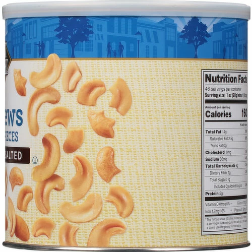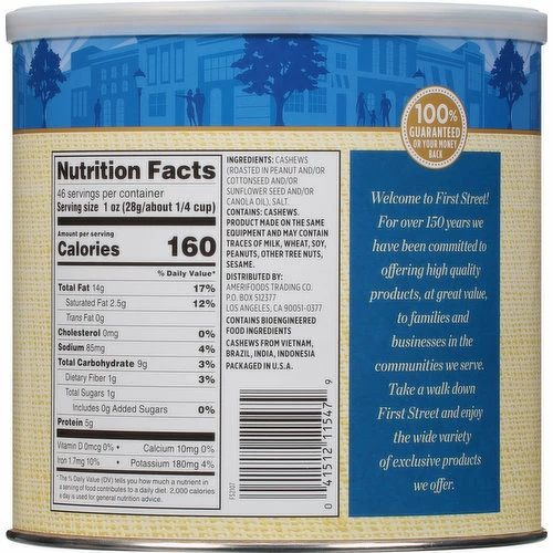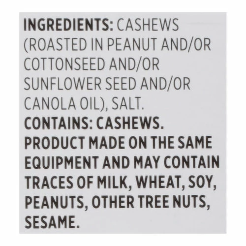 Cashews (Roasted in Peanut and/or Cottonseed and/or Sunflower Seed and/or Canola Oil), Salt.
