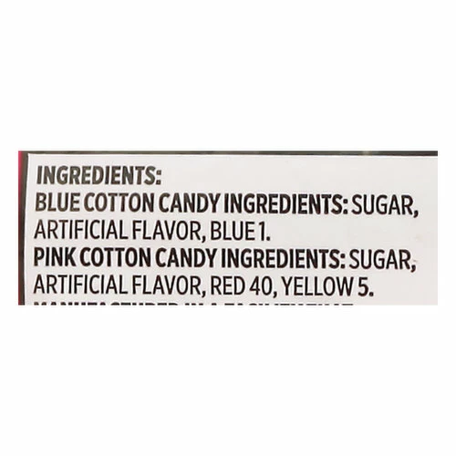 Blue Cotton Candy Ingredients: Sugar, Artificial Flavor, Blue 1. Pink Cotton Candy Ingredients: Sugar, Artificial Flavor, Red 40, Yellow 5.