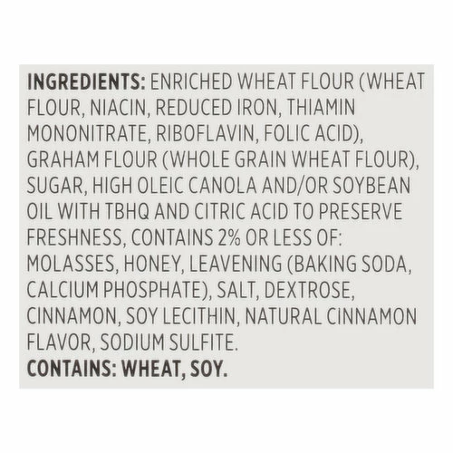 Enriched Wheat Flour (Wheat Flour, Niacin, Reduced Iron, Thiamin Mononitrate, Riboflavin, Folic Acid), Graham Flour (Whole Grain Wheat Flour), Sugar, High Oleic Canola and/or Soybean Oil with TBHQ and Citric Acid to Preserve Freshness, Contains 2% or Less of: Molasses, Honey, Leavening (Baking Soda, Calcium Phosphate), Salt, Dextrose, Cinnamon, Soy Lecithin, Natural Cinnamon Flavor, Sodium Sulfite.