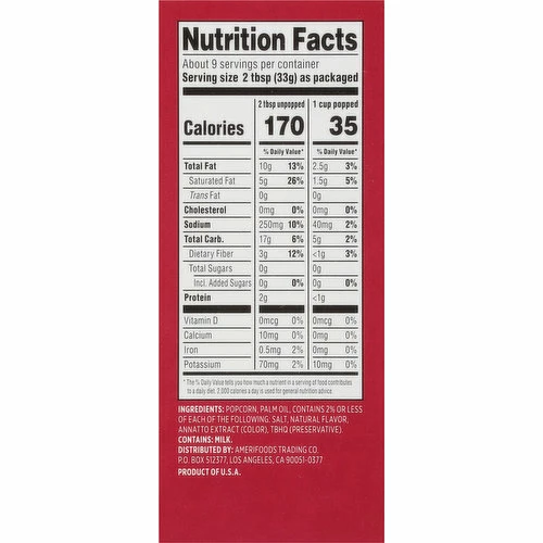 Popcorn, Palm Oil, Contains 2% or Less of Each of the Following: Salt, Natural Flavor, Annatto Extract (Color), TBHQ (Preservative).