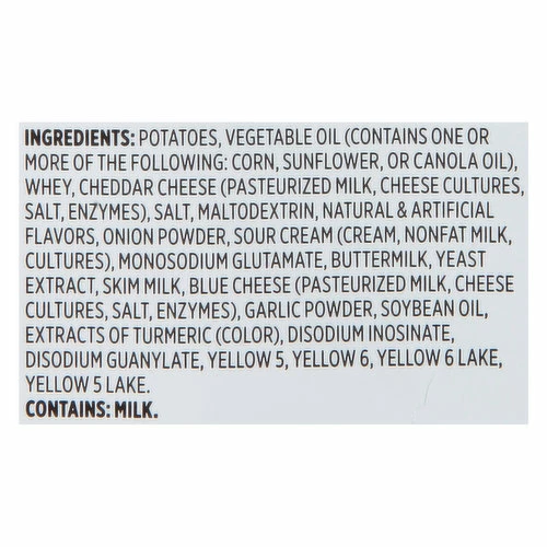 Potatoes, Vegetable Oil (Contains One or More of the Following: Corn, Sunflower, or Canola Oil), Whey, Cheddar Cheese (Pasteurized Milk, Cheese Cultures, Salt, Enzymes), Salt, Maltodextrin, Natural & Artificial Flavors, Onion Powder, Sour Cream (Cream, Nonfat Milk, Cultures), Monosodium Glutamate, Buttermilk, Yeast Extract, Skim Milk, Blue Cheese (Pasteurized Milk, Cheese Cultures, Salt, Enzymes), Garlic Powder, Soybean Oil, Extracts of Turmeric (Color), Disodium Inosinate, Disodium Guanylate, Yellow 5, Yellow 6, Yellow 6 Lake, Yellow 5 Lake.