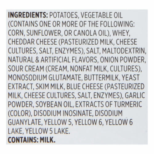Potatoes, Vegetable Oil (Contains One or More of the Following: Corn, Sunflower, or Canola Oil), Whey, Cheddar Cheese (Pasteurized Milk, Cheese Cultures, Salt, Enzymes), Salt, Maltodextrin, Natural & Artificial Flavors, Onion Powder, Sour Cream (Cream, Nonfat Milk, Cultures), Monosodium Glutamate, Buttermilk, Yeast Extract, Skim Milk, Blue Cheese (Pasteurized Milk, Cheese Cultures, Salt, Enzymes), Garlic Powder, Soybean Oil, Extracts of Turmeric (Color), Disodium Inosinate, Disodium Guanylate, Yellow 5, Yellow 6, Yellow 6 Lake, Yellow 5 Lake.