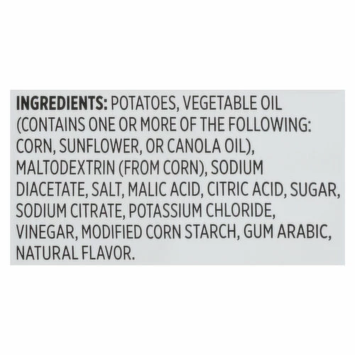 Potatoes, Vegetable Oil (Contains One or More of the Following: Corn, Sunflower, or Canola Oil), Maltodextrin (from Corn), Sodium Diacetate, Salt, Malic Acid, Citric Acid, Sugar, Sodium Citrate, Potassium Chloride, Vinegar, Modified Corn Starch, Gum Arabic, Natural Flavor.