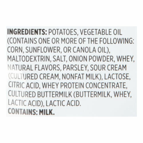 Potatoes, Vegetable Oil (Contains One or More of the Following: Corn, Sunflower, or Canola Oil), Maltodextrin, Salt, Onion Powder, Whey, Natural Flavors, Parsley, Sour Cream (Cultured Cream, Nonfat Milk), Lactose, Citric Acid, Whey Protein Concentrate, Cultured Buttermilk (Buttermilk, Whey, Lactic Acid), Lactic Acid.