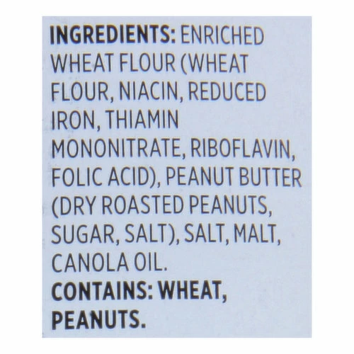 Enriched Wheat Flour (Wheat Flour, Niacin, Reduced Iron, Thiamin Mononitrate, Riboflavin, Folic Acid), Peanut Butter (Dry Roasted Peanuts, Sugar, Salt), Salt, Malt, Canola Oil.