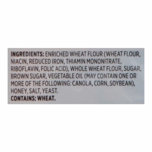 Enriched Wheat Flour (Wheat Flour, Niacin, Reduced Iron, Thiamin Mononitrate, Riboflavin, Folic Acid), Whole Wheat Flour, Sugar, Brown Sugar, Vegetable Oil (May Contain One or More of the Following: Canola, Corn, Soybean), Honey, Salt, Yeast.