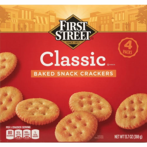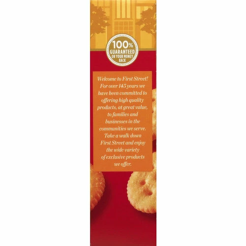 Per 5 Cracker Serving: 80 calories; 1 g sat fat (3% DV); 105 mg sodium (5% DV); 1 g total sugars. Since 1871. Welcome to First Street! For over 145 years we have been committed to offering high quality products, at great value, to families and businesses in the communities we serve. Take a walk down First Street and enjoy the wide variety of exclusive products we offer. 100% guaranteed or your money back.