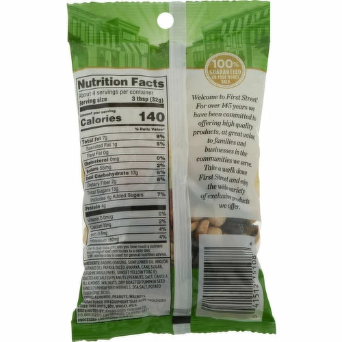 Raisins (Raisins, Sunflower Oil and/or Vegetable Oil), Papaya Diced (Papaya, Cane Sugar, Sulfur Metabisulphite, Sunset Yellow FD&C 6), Roasted and Salted Peanuts (Peanuts, Salt, Canola Oil), Almonds, Walnuts, Dry Roasted Pumpkin Seed Kernels (Pumpkin Seed Kernels, Sea Salt, Potato Starch, Citric Acid).