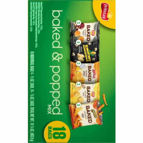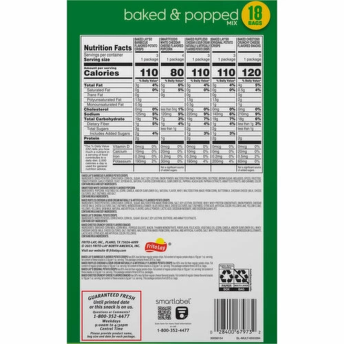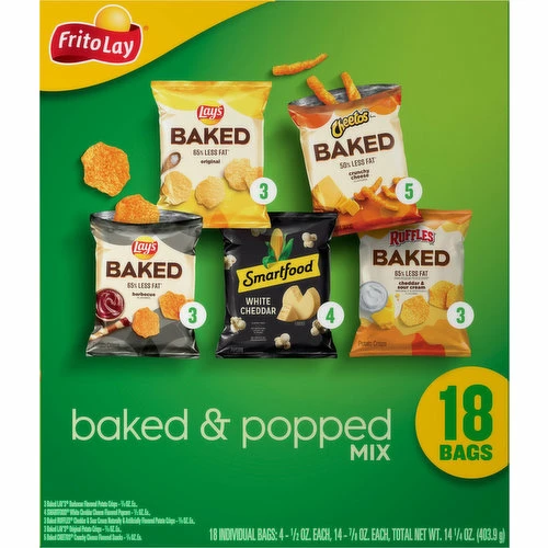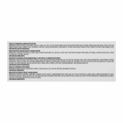Baked Lay’s Barbecue Flavored Potato Crisps Ingredients: Dried Potatoes, Corn Starch, Corn Oil, Sugar, Salt, Soy Lecithin, Onion Powder, Maltodextrin (Made from Corn), Dextrose, Brown Sugar, Molasses, Spices, Fructose, Tomato Powder, Garlic Powder, Yeast, Soybean Oil, Natural Flavors (Contains Milk), Sunflower Oil, Paprika, Acacia Gum, Paprika Extracts, Annatto Extracts, and Caramel Color, Smartfood White Cheddar Cheese Flavored Popcorn Ingredients: Popcorn, Vegetable Oil (Corn, Canola, and/or Sunflower Oil), Natural Flavor, Whey, Maltodextrin (Made from Corn), Buttermilk, Cheddar Cheese (Milk, Cheese Cultures, Salt, Enzymes), and Salt, Baked Ruffles Cheddar & Sour Cream Naturally & Artificially Flavored Potato Crisps Ingredients: Dried Potatoes, Corn Starch, Corn Oil, Sugar, Maltodextrin (Made from Corn), Salt, Soy Lecithin, Dextrose, Whey Protein Concentrate, Onion Powder, Cheddar Cheese (Milk, Cheese Cultures, Salt, Enzymes), Monosodium Glutamate, Blue Cheese (Milk, Cheese Cultures, Salt, Enzymes), Citric Acid, Artificial Color (Yellow 6 Lake, Yellow 5 Lake, Yellow 5, Yellow 6), Skim Milk, Natural and Artificial Flavors, Garlic Powder, Lactic Acid, Disodium Inosinate, and Disodium Guanylate, Baked Lay’s Original Potato Crisps Ingredients: Dried Potatoes, Corn Starch, Corn Oil, Sugar, Sea Salt, Soy Lecithin, Dextrose, and Annatto Extracts, Baked Cheetos Crunchy Cheese Flavored Snacks Ingredients: Enriched Corn Meal (Corn Meal, Ferrous Sulfate, Niacin, Thiamin Mononitrate, Riboflavin, Folic Acid), Vegetable Oil (Corn, Canola, and/or Sunflower Oil), Whey, Cheddar Cheese (Milk, Cheese Cultures, Salt, Enzymes), Maltodextrin (Made from Corn), Natural and Artificial Flavors, Salt, Whey Protein Concentrate, Monosodium Glutamate, Lactic Acid, Citric Acid, and Artificial Color (Yellow 6).