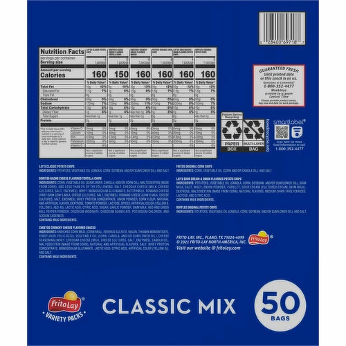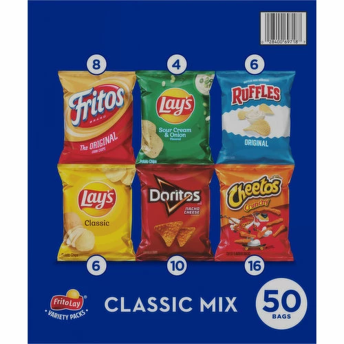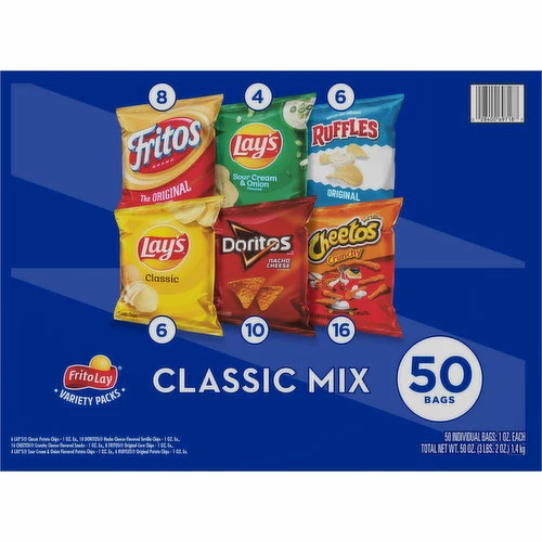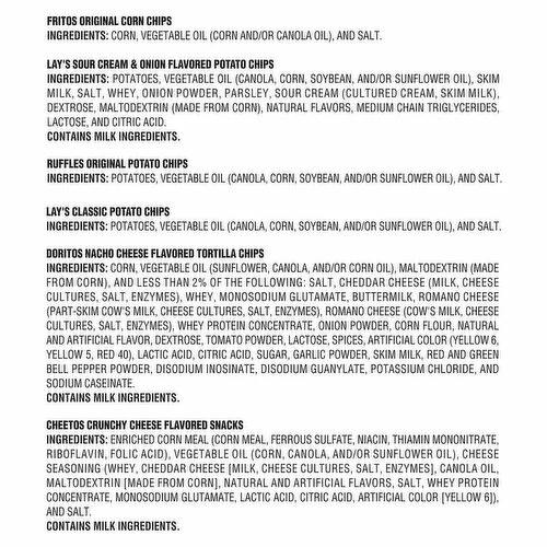 Lay’s Sour Cream & Onion Flavored Potato Chips: Potatoes, Vegetable Oil (Canola, Corn, Soybean, and/or Sunflower Oil), Skim Milk, Salt, Whey, Onion Powder, Parsley, Sour Cream (Cultured Cream, Skim Milk), Dextrose, Maltodextrin (Made from Corn), Natural Flavors, Medium Chain Triglycerides, Lactose, and Citric Acid. Ruffles Original Potato Chips: Potatoes, Vegetable Oil (Canola, Corn, Soybean, and/or Sunflower Oil), and Salt. Fritos Original Corn Chips: Corn, Vegetable Oil (Corn and/or Canola Oil), and Salt. Doritos Nacho Cheese Flavored Tortilla Chips: Corn, Vegetable Oil (Sunflower, Canola, and/or Corn Oil), Maltodextrin (Made from Corn), and Less than 2% of the Following: Salt, Cheddar Cheese (Milk, Cheese Cultures, Salt, Enzymes), Whey, Monosodium Glutamate, Buttermilk, Romano Cheese (Part-Skim Cow’s Milk, Cheese Cultures, Salt, Enzymes), Romano Cheese (Cow’s Milk, Cheese Cultures, Salt, Enzymes), Whey Protein Concentrate, Onion Powder, Corn Flour, Natural and Artificial Flavor, Dextrose, Tomato Powder, Lactose, Spices, Artificial Color (Yellow 6, Yellow 5, Red 40), Lactic Acid, Citric Acid, Sugar, Garlic Powder, Skim Milk, Red and Green Bell Pepper Powder, Disodium Inosinate, Disodium Guanylate, Potassium Chloride, and Sodium Caseinate. Lay’s Classic Potato Chips: Potatoes, Vegetable Oil (Canola, Corn, Soybean, and/or Sunflower Oil), and Salt. Cheetos Crunchy Cheese Flavored Snacks: Enriched Corn Meal (Corn Meal, Ferrous Sulfate, Niacin, Thiamin Mononitrate, Riboflavin, Folic Acid), Vegetable Oil (Corn, Canola, and/or Sunflower Oil), Cheese Seasoning (Whey, Cheddar Cheese [Milk, Cheese Cultures, Salt, Enzymes], Canola Oil, Maltodextrin [Made from Corn], Natural and Artificial Flavors, Salt, Whey Protein Concentrate, Monosodium Glutamate, Lactic Acid, Citric Acid, Artificial Color [Yellow 6]), and Salt.