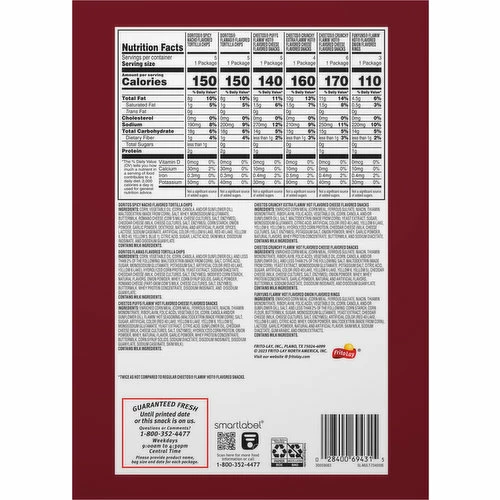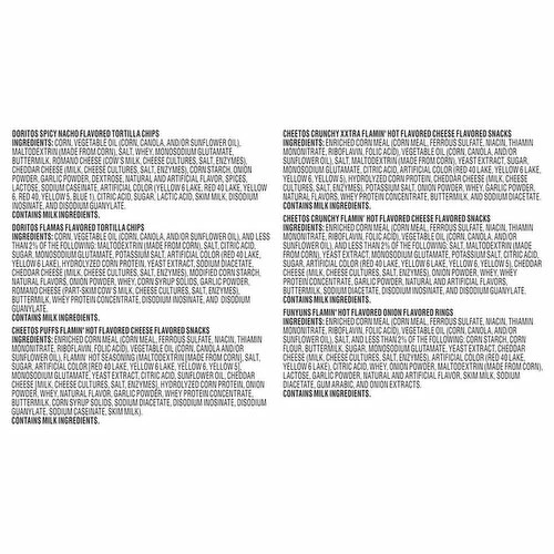 Funyuns Flamin’ Hot Flavored Onion Flavored Rings: Enriched Corn Meal (Corn Meal, Ferrous Sulfate, Niacin, Thiamin Mononitrate, Riboflavin, Folic Acid), Vegetable Oil (Corn, Canola, and/or Sunflower Oil), Salt, and Less than 2% of the Following: Corn Starch, Corn Flour, Buttermilk, Sugar, Monosodium Glutamate, Yeast Extract, Cheddar Cheese (Milk, Cheese Cultures, Salt, Enzymes), Artificial Color (Red 40 Lake, Yellow 6 Lake), Citric Acid, Whey, Onion Powder, Maltodextrin (Made from Corn), Lactose, Garlic Powder, Natural and Artificial Flavor, Skim Milk, Sodium Diacetate, Gum Arabic, and Onion Extracts. Cheetos Crunchy Xxtra Flamin’ Hot Cheese Flavored Snacks: Enriched Corn Meal (Corn Meal, Ferrous Sulfate, Niacin, Thiamin Mononitrate, Riboflavin, Folic Acid), Vegetable Oil (Corn, Canola, and/or Sunflower Oil), Salt, Maltodextrin (Made from Corn), Yeast Extract, Sugar, Monosodium Glutamate, Citric Acid, Artificial Color (Red 40 Lake, Yellow 6 Lake, Yellow 6, Yellow 5), Hydrolyzed Corn Protein, Cheddar Cheese (Milk, Cheese Cultures, Salt, Enzymes), Potassium Salt, Onion Powder, Whey, Garlic Powder, Natural Flavors, Whey Protein Concentrate, Buttermilk, and Sodium Diacetate. Doritos Spicy Nacho Flavored Tortilla Chips: Corn, Vegetable Oil (Corn, Canola, and/or Sunflower Oil), Maltodextrin (Made from Corn), Salt, Whey, Monosodium Glutamate, Buttermilk, Romano Cheese (Cow’s Milk, Cheese Cultures, Salt, Enzymes), Cheddar Cheese (Milk, Cheese Cultures, Salt, Enzymes), Corn Starch, Onion Powder, Garlic Powder, Dextrose, Natural and Artificial Flavor, Spices, Lactose, Sodium Caseinate, Artificial Color (Yellow 6 Lake, Red 40 Lake, Yellow 6, Red 40, Yellow 5, Blue 1), Citric Acid, Sugar, Lactic Acid, Skim Milk, Disodium Inosinate, and Disodium Guanylate. Cheetos Crunchy Flamin’ Hot Cheese Flavored Snacks: Enriched Corn Meal (Corn Meal, Ferrous Sulfate, Niacin, Thiamin Mononitrate, Riboflavin, Folic Acid), Vegetable Oil (Corn, Canola, and/or Sunflower Oil), and Less than 2% of the Following: Salt, Maltodextrin (Made from Corn), Yeast Extract, Monosodium Glutamate, Potassium Salt, Citric Acid, Sugar, Artificial Color (Red 40 Lake, Yellow 6 Lake, Yellow 6, Yellow 5), Cheddar Cheese (Milk, Cheese Cultures, Salt, Enzymes), Onion Powder, Whey, Whey Protein Concentrate, Garlic Powder, Natural and Artificial Flavors, Buttermilk, Sodium Diacetate, Disodium Inosinate, and Disodium Guanylate. Cheetos Puffs Flamin’ Hot Cheese Flavored Snacks: Enriched Corn Meal (Corn Meal, Ferrous Sulfate, Niacin, Thiamin Mononitrate, Riboflavin, Folic Acid), Vegetable Oil (Corn, Canola and/or Sunflower Oil), Flamin’ Hot Seasoning (Maltodextrin [Made from Corn], Salt, Sugar, Artificial Color [Red 40 Lake, Yellow 6 Lake, Yellow 6, Yellow 5], Monosodium Glutamate, Yeast Extract, Citric Acid, Sunflower Oil, Cheddar Cheese [Milk, Cheese Cultures, Salt, Enzymes], Hydrolyzed Corn Protein, Onion Powder, Whey, Natural Flavor, Garlic Powder, Whey Protein Concentrate, Buttermilk, Corn Syrup Solids, Sodium Diacetate, Disodium Inosinate, Disodium Guanylate, Sodium Caseinate, Skim Milk). Doritos Flamas Flavored Tortilla ChipsCheetos Puffs: Corn, Vegetable Oil (Corn, Canola, and/or Sunflower Oil), and Less than 2% of the Following: Maltodextrin (Made from Corn), Salt, Citric Acid, Sugar, Monosodium Glutamate, Potassium Salt, Artificial Color (Red 40 Lake, Yellow 6 Lake), Hydrolyzed Corn Protein, Yeast Extract, Sodium Diacetate, Cheddar Cheese (Milk, Cheese Cultures, Salt, Enzymes), Modified Corn Starch, Natural Flavors, Onion Powder, Whey, Corn Syrup Solids, Garlic Powder, Romano Cheese (Part-Skim Cow’s Milk, Cheese Cultures, Salt, Enzymes), Buttermilk, Whey Protein Concentrate, Disodium Inosinate, and Disodium Guanylate.
