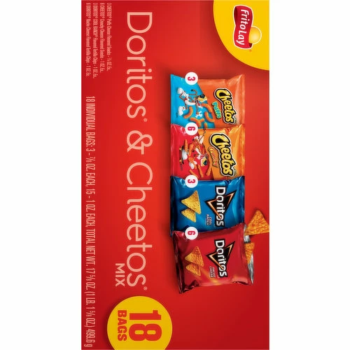 3 Cheetos puffs cheese flavored snacks – 7/8 oz ea. 6 Cheetos crunchy cheese flavored snacks – 1 oz ea. 3 Doritos cook ranch flavored tortilla chips – 1oz ea. 6 Doritos nacho cheese flavored tortilla chips – 1 oz ea. 18 Individual bags. fritolay.com. how2recycle.info. SmartLabel: Scan for more food information or call 1-800-352-4477. Visit our website (at) fritolay.com. Questions or Comments? 1-800-352-4477. Weekdays 9:00 am to 4:30 pm Central Time. Please provide product name, bag size, and date for each package.