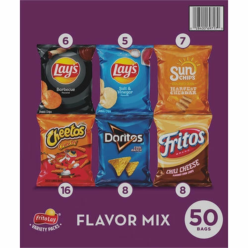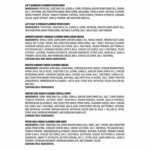 Cheetos Crunchy Cheese Flavored Snacks: Cheetos Crunchy Cheese Flavored Snacks Ingredients: Enriched Corn Meal (Corn Meal, Ferrous Sulfate, Niacin, Thiamin Mononitrate, Riboflavin, Folic Acid), Vegetable Oil (Corn, Canola, and/or Sunflower Oil), Cheese Seasoning (Whey, Cheddar Cheese [Milk, Cheese Cultures, Salt, Enzymes], Canola Oil, Maltodextrin [Made from Corn], Natural and Artificial Flavors, Salt, Whey Protein Concentrate, Monosodium Glutamate, Lactic Acid, Citric Acid, Artificial Color [Yellow 6]), and Salt. Doritos Cool Ranch Flavored Tortilla Chips: Doritos Cool Ranch Flavored Tortilla Chips Ingredients: Corn, Vegetable Oil (Corn, Canola, and/or Sunflower Oil), Salt, Corn Starch, Tomato Powder, Lactose, Whey, Skim Milk, Onion Powder, Sugar, Garlic Powder, Monosodium Glutamate, Maltodextrin (Made from Corn), Cheddar Cheese (Milk, Cheese Cultures, Salt, Enzymes), Dextrose, Malic Acid, Corn Syrup Solids, Buttermilk, Natural and Artificial Flavors, Sodium Acetate, Artificial Color (Red 40, Blue 1, Yellow 5), Spice, Citric Acid, Disodium Inosinate, and Disodium Guanylate. Fritos Chili Cheese Flavored Corn Chips: Fritos Chili Cheese Flavored Corn Chips Ingredients: Corn, Vegetable Oil (Corn and/or Canola Oil), Whey, Salt, Spices, Maltodextrin (Made from Corn), Cheddar Cheese (Milk, Cheese Cultures, Salt, Enzymes), Potassium Salt, Tomato Powder, Monosodium Glutamate, Onion Powder, Natural Flavors, Romano Cheese (Cow’s Milk, Cheese Cultures, Salt, Enzymes), Dextrose, Sugar, Buttermilk, Sodium Caseinate, Annatto Extracts, Butter (Cream, Salt), Citric Acid, Sunflower Oil, Garlic Powder, Disodium Inosinate, Disodium Guanylate, and Caramel Color. Lay’s Barbecue Flavored Potato Chips: Lay’s Barbecue Flavored Potato Chips Ingredients: Potatoes, Vegetable Oil (Canola, Corn, Soybean, and/or Sunflower Oil), Sugar, Salt, Dextrose, Maltodextrin (Made from Corn), Molasses, Torula Yeast, Natural Flavors, Onion Powder, Spices, Tomato Powder, Paprika, Corn Starch, Paprika Extracts, Caramel Color, Yeast Extract, Garlic Powder, and Mustard Seed Oil. Lay’s Salt & Vinegar Flavored Potato Chips: Lay’s Salt & Vinegar Flavored Potato Chips Ingredients: Potatoes, Vegetable Oil (Canola, Corn, Soybean, and/or Sunflower Oil), Maltodextrin (Made from Corn), Natural Flavors, Salt, Malic Acid, and Vinegar. Sunchips Harvest Cheddar Flavored Whole Grain Snacks: Sunchips Harvest Cheddar Flavored Whole Grain Snacks Ingredients: Whole Corn, Sunflower and/or Canola Oil, Whole Wheat, Brown Rice Flour, Whole Oat Flour, Sugar, Maltodextrin (Made from Corn), Salt, Whey, Natural Flavors, Cheddar Cheese (Milk, Cheese Cultures, Salt, Enzymes), Onion Powder, Buttermilk, Potassium Salt, Romano Cheese (Cow’s Milk, Cheese Cultures, Salt, Enzymes), Yeast Extract, Lactose, Paprika Extracts, Sodium Caseinate, Citric Acid, Skim Milk, Garlic Powder, Lactic Acid, and Parmesan Cheese (Milk, Cheese Cultures, Salt, Enzymes).