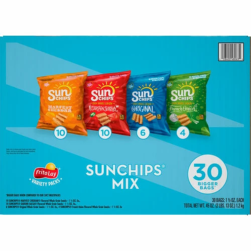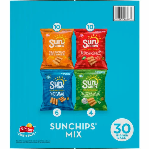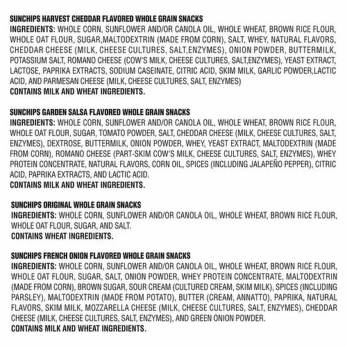Sunchips Harvest Cheddar Flavored Whole Grain Snacks: Whole Corn, Sunflower and/or Canola Oil, Whole Wheat, Brown Rice Flour, Whole Oat Flour, Sugar, Maltodextrin (Made from Corn), Salt, Whey, Natural Flavors, Cheddar Cheese (Milk, Cheese Cultures, Salt, Enzymes), Onion Powder, Buttermilk, Potassium Salt, Romano Cheese (Cow’s Milk, Cheese Cultures, Salt, Enzymes), Yeast Extract, Lactose, Paprika Extracts, Sodium Caseinate, Citric Acid, Skim Milk, Garlic Powder, Lactic Acid, and Parmesan Cheese (Milk, Cheese Cultures, Salt, Enzymes). Sunchips Garden Salsa Flavored Whole Grain Snacks: Whole Corn, Sunflower and/or Canola Oil, Whole Wheat, Brown Rice Flour, Whole Oat Flour, Sugar, Tomato Powder, Salt, Cheddar Cheese (Milk, Cheese Cultures, Salt, Enzymes), Dextrose, Buttermilk, Onion Powder, Whey, Yeast Extract, Maltodextrin (Made from Corn), Romano Cheese (Part-Skim Cow’s Milk, Cheese Cultures, Salt, Enzymes), Whey Protein Concentrate, Natural Flavors, Corn Oil, Spices (Including Jalapeno Pepper), Citric Acid, Paprika Extracts, and Lactic Acid. Sunchips Original Whole Grain Snacks: Whole Corn, Sunflower and/or Canola Oil, Whole Wheat, Brown Rice Flour, Whole Oat Flour, Sugar, and Salt. Sunchips French Onion Flavored Whole Grain Snacks: Whole Corn, Sunflower and/or Canola Oil, Whole Wheat, Brown Rice Flour, Whole Oat Flour, Sugar, Salt, Onion Powder, Whey Protein Concentrate, Maltodextrin (Made from Corn), Brown Sugar, Sour Cream (Cultured Cream, Skim Milk), Spices (Including Parsley), Maltodextrin (Made from Potato), Butter (Cream, Annatto), Paprika, Natural Flavors, Skim Milk, Mozzarella Cheese (Milk, Cheese Cultures, Salt, Enzymes), Cheddar Cheese (Milk, Cheese Cultures, Salt, Enzymes), and Green Onion Powder.