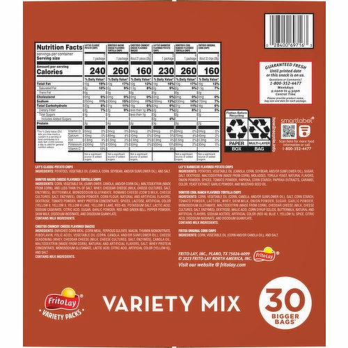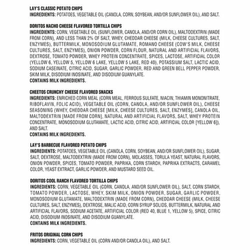Lay’s Classic Potato Chips: Potatoes, Vegetable Oil (Canola, Corn, Soybean, and/or Sunflower Oil), and Salt. Doritos Nacho Cheese Flavored Tortilla Chips: Corn, Vegetable Oil (Sunflower, Canola, and/or Corn Oil), Maltodextrin (Made from Corn), and Less than 2% of Salt, Whey, Cheddar Cheese (Milk, Cheese Cultures, Salt, Enzymes), Buttermilk, Monosodium Glutamate, Romano Cheese (Cow’s Milk, Cheese Cultures, Salt, Enzymes), Onion Powder, Corn Flour, Natural and Artificial Flavors, Dextrose, Tomato Powder, Whey Protein Concentrate, Spices, Lactose, Artificial Color (Yellow 6, Yellow 5, Yellow 6 Lake, Yellow 5 Lake, Red 40), Potassium Salt, Lactic Acid, Sodium Caseinate, Citric Acid, Sugar, Garlic Powder, Red and Green Bell Pepper Powder, Skim Milk, Disodium Inosinate, and Disodium Guanylate. Cheetos Crunchy Cheese Flavored Snacks: Enriched Corn Meal (Corn Meal, Ferrous Sulfate, Niacin, Thiamin Mononitrate, Riboflavin, Folic Acid), Vegetable Oil (Corn, Canola, and/or Sunflower Oil), Cheese Seasoning (Whey, Cheddar Cheese (Milk, Cheese Cultures, Salt, Enzymes], Canola Oil, Maltodextrin [Made from Corn], Natural and Artificial Flavors, Salt, Whey Protein Concentrate, Monosodium Glutamate, Lactic Acid, Citric Acid, Artificial Color [Yellow 6]), and Salt. Lay’s Barbecue Flavored Potato Chips: Potatoes, Vegetable Oil (Canola, Corn, Soybean, and/or Sunflower Oil), Sugar, Salt, Dextrose, Maltodextrin (Made from Corn), Molasses, Torula Yeast, Natural Flavors Onion Powder, Spices, Tomato Powder, Paprika, Corn Starch, Paprika Extracts, Caramel Color, Yeast Extract, Garlic Powder, and Mustard Seed Oil. Doritos Cool Ranch Flavored Tortilla Chips: Corn, Vegetable Oil (Corn, Canola, and/or Sunflower Oil), Salt, Corn Starch Tomato Powder, Lactose, Whey, Skim Milk, Onion Powder, Sugar, Garlic Poder, Monosodium Glutamate, Maltodextrin (Made from Corn), Cheddar Cheese (Milk, Cheese Cultures, Salt, Enzymes), Dextrose, Malic Acid, Corn Syrup Solids, Buttermilk, Natural and Artificial Flavors, Sodium Acetate, Artificial Color (Red 40, Blue 1, Yellow 5), Spice, Citric Acid, Disodium Inosinate, and Disodium Guanylate. Fritos Original Corn Chips: Corn, Vegetable Oil (Corn and/or Canola Oil), and Salt.