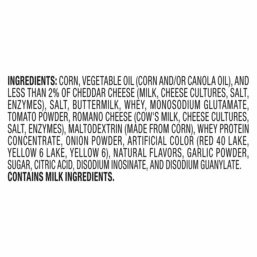 Corn, Vegetable Oil (Corn and/or Canola Oil), and Less than 2% of Cheddar Cheese (Milk, Cheese Cultures, Salt, Enzymes), Salt, Buttermilk, Whey, Monosodium Glutamate, Tomato Powder, Romano Cheese (Cow’s Milk, Cheese Cultures, Salt, Enzymes), Maltodextrin (Made from Corn), Whey Protein Concentrate, Onion Powder, Artificial Color (Red 40 Lake, Yellow 6 Lake, Yellow 6), Natural Flavors, Garlic Powder, Sugar, Citric Acid, Disodium Inosinate, and Disodium Guanylate.