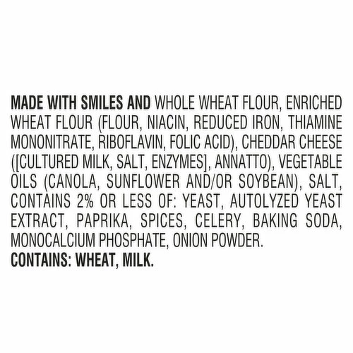 Made with Smiles and Whole Wheat Flour, Enriched Wheat Flour (Flour, Niacin, Reduced Iron, Thiamine Mononitrate, Riboflavin, Folic Acid), Cheddar Cheese ([Cultured Milk, Salt, Enzymes], Annatto), Vegetable Oils (Canola, Sunflower and/or Soybean), Salt, Contains 2% or Less of: Yeast, Autolyzed Yeast Extract, Paprika, Spices, Celery, Baking Soda, Monocalcium Phosphate, Onion Powder.