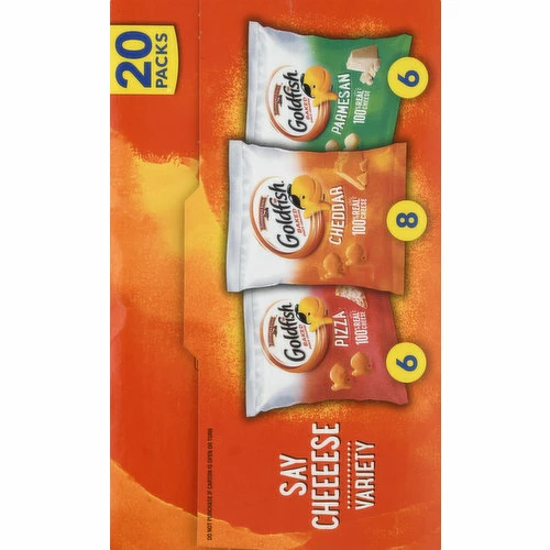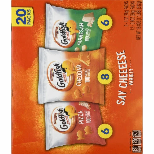 5 – 1 oz (28 g) Packs. 12 – 0.9 oz (26 g) packs. 6 Pizza. 8 Cheddar. 6 Parmesan. Cheddar: 130 calories per pack. Parmesan: 120 calories per pack. Pizza: 120 calories per pack. The ingredients from sugar, soy, and canola in this product come from genetically modified crops. Learn more at pepperidgefarm.com. Satisfaction guaranteed. www.GoldfishSmiles.com. how2recycle.info. For questions or comments, please call 1-888-737-7374. – Thank you. Visit our website at www.GoldfishSmiles.com. Baked in USA.