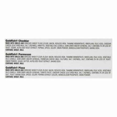 Goldfish Cheddar Made with Smiles and Enriched Wheat Flour (Flour Niacin, Reduced Iron, Thiamine Mononitrate, Riboflavin, Folic Acid), Cheddar Cheese ([Cultured Milk, Salt, Enzymes], Annatto), Vegetable Oils (Canola, Sunflower and/or Soybean), Salt, Contains 2% or Less of: Yeast, Sugar, Autolyzed Yeast Extract, Paprika, Spices, Celery, Onion Powder Monocalcium Phosphate Baking Soda. Goldfish Parmesan Made with Smiles and Enriched Wheat Flour (Flour, Niacin, Reduced Iron, Thiamine Mononitrate, Riboflavin, Folic Acid), Vegetable Oil (Canola, Sunflower and/or Soybean), Parmesan Cheese (Milk Cultures, Salt, Enzymes), Salt, Contains 2% or Less of: Yeast, Onion Powder Sugar, Butter, Autolyzed Yeast Extract, Baking Soda. Goldfish Pizza Made with Smiles and Enriched Wheat Flour (Flour, Niacin, Reduced Iron Thiamine Mononitrate, Riboflavin, Folic Acid), Vegetable Oils (Canola, Sunflower and/or Soybean), Tomato Paste, Cheddar Cheese (Cultured Milk, Salt, Enzymes), Contains 2% or Less of: Salt, Yeast. Baking Soda, Spices, Celery, Paprika Extract (Color), Monocalcium Phosphate, Onion Powder.